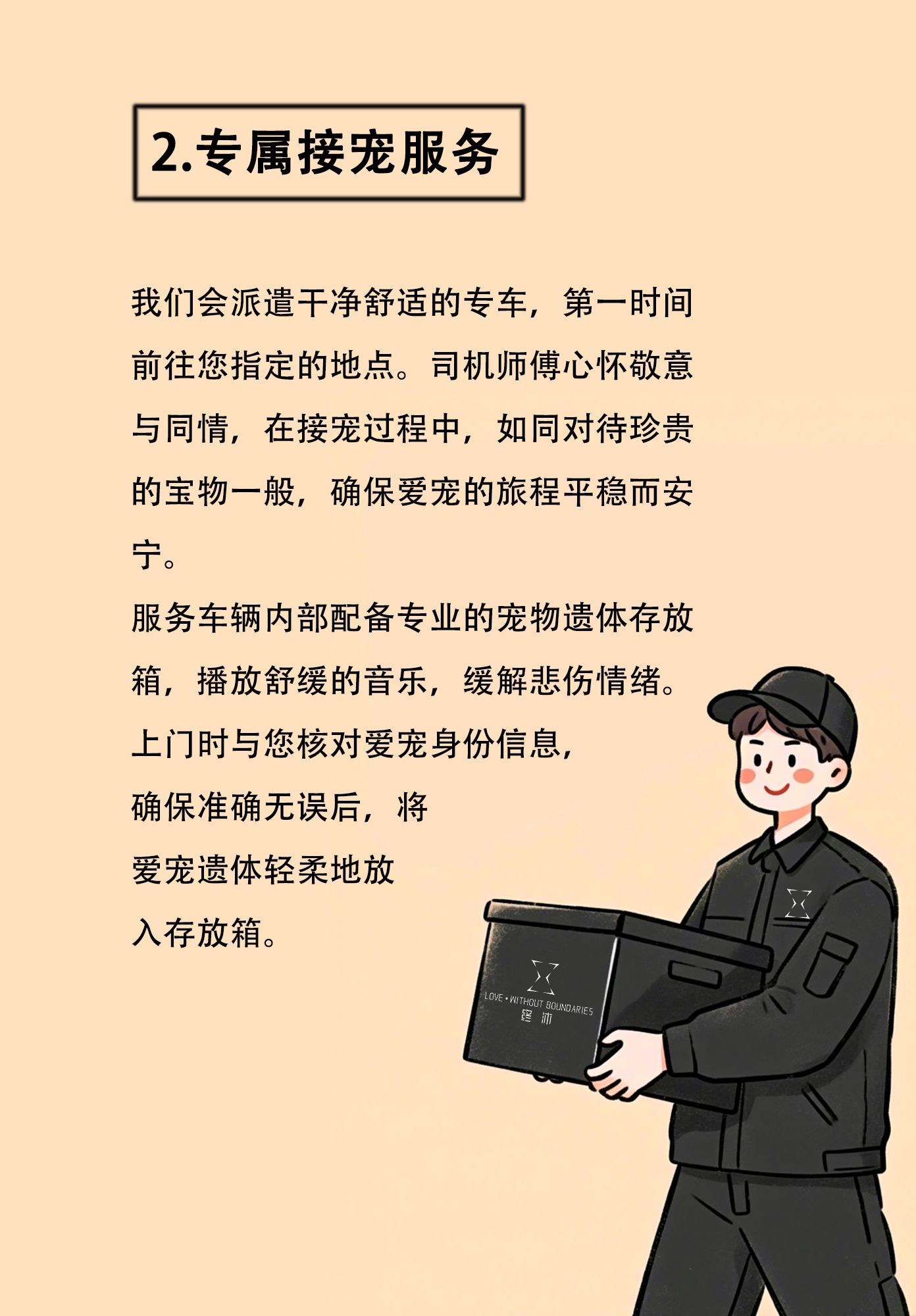 全流程宠护:爱宠告别一站式服务/贴心预约定制/01您可以随时联系我们,只要一个电话,或者一条消息,我们永远在您身后。客服人员在接到预约后,终沐人将与宠主取得联系,询问爱宠的品种、年龄、体重、离世原因,并将信息详细录入客户档案。预约成功后,客服与主人确认爱宠服务善终、方案接宠时间、地点。预约渠道多元便捷&n